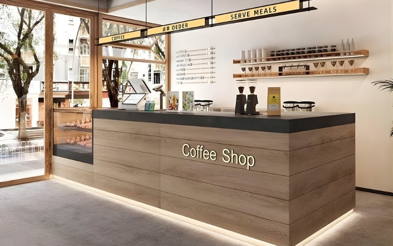 - Mẫu quầy chữ L kết hợp nhận diện thương hiệu: Kết hợp vật liệu như gỗ, đá và đèn LED cùng logo mặt quầy giúp tăng nhận diện thương hiệu và tạo điểm nhấn thẩm mỹ cho không gian.