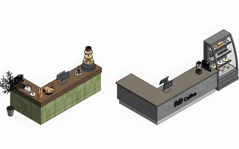 - Đối với quán cà phê nhỏ, tổng chiều dài quầy nên dao động từ 3 – 3.5m để tối ưu diện tích.
