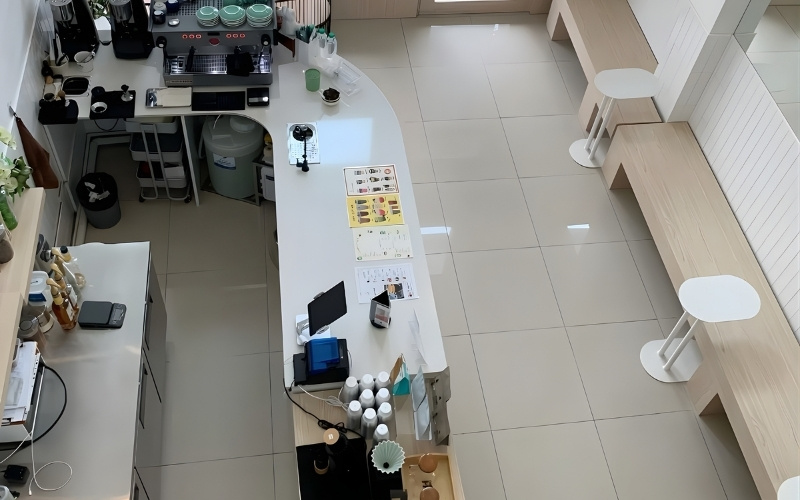 Khoảng cách di chuyển trong quầy nên đảm bảo từ 80-100cm để thuận tiện thao tác, đồng thời cần tính toán kỹ hệ thống điện, cấp thoát nước và vị trí đặt thiết bị. Việc bố trí hợp lý ngay từ đầu không chỉ giúp vận hành ổn định mà còn hạn chế phát sinh chi phí chỉnh sửa về sau.